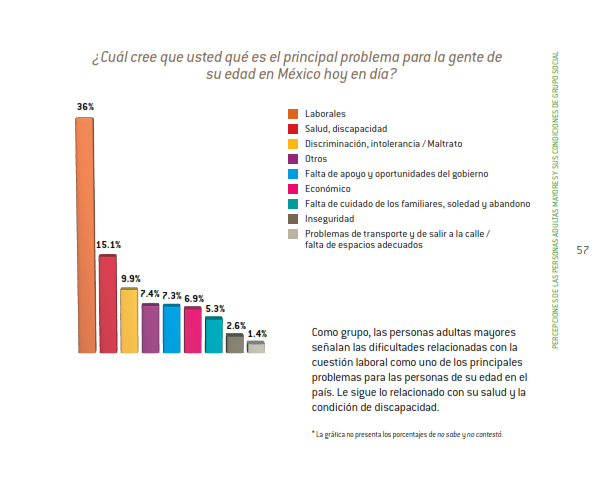 Para las Naciones Unidas, la búsqueda de la justicia social para todos es el núcleo de su misión global para promover el desarrollo y la dignidad humana, sin embargo, en México la edad es un importante factor de discriminación económica y social: sólo 11.7 por ciento de la población nacional de adultos mayores reciben una pensión por su trabajo, mientras el 57.9 carece de ella, al mismo tiempo que son inexistentes nuevas oportunidades de empleo decoroso y digno así como el acceso a servicios sociales de salud, vivienda, educación y recreación.