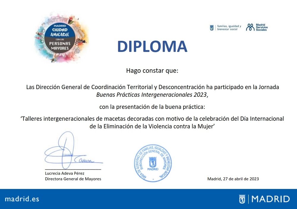 El Taller intergeneracional de decoración de macetas desarrollado por la Unidad Distrital de Colaboración (UDC) de San Blas-Canillejas ha sido reconocido como una Buena Práctica Intergeneracional por la Dirección General de Mayores, y como tal, incluido en el catálogo de buenas prácticas intergeneracionales.